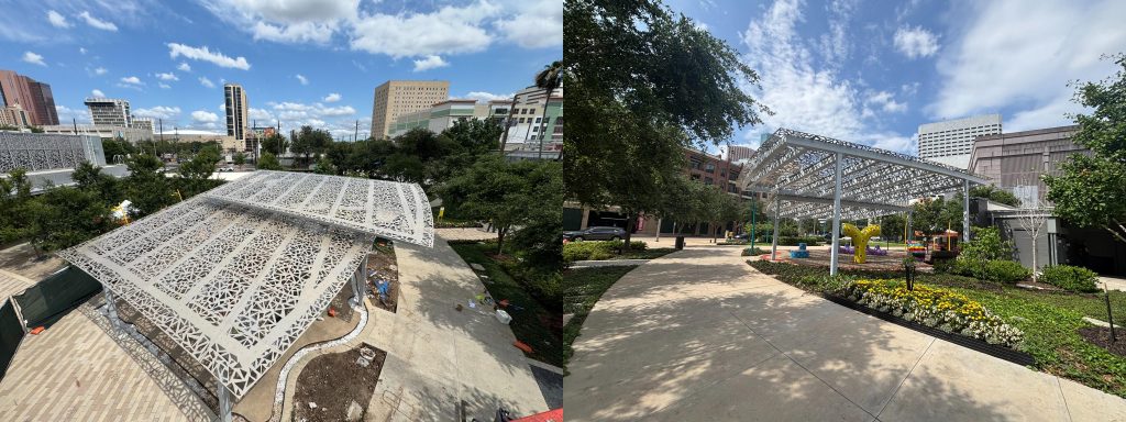 The patterned steel panels create beautiful shadows throughout the day, and the structure itself is built to handle Houston’s weather without losing its sleek look. It’s more than just shade — it’s a piece of the park’s identity, and we’re proud to have brought it to life for the community to enjoy.
