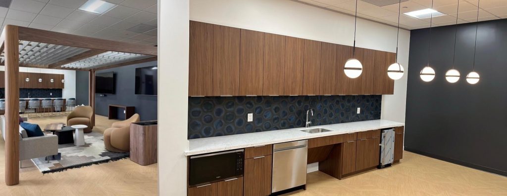 Our interior remodel for Locust Street Group in Market Street, The Woodlands, TX, exemplifies our expertise in crafting sophisticated, highly functional commercial spaces. This project transformed a key common area into a modern, inviting breakroom/kitchenette, featuring extensive custom warm-toned cabinetry that provides ample storage and a sleek aesthetic, perfectly complemented by pristine quartz countertops and a unique, artistic backsplash with a captivating blue and black circular pattern. We seamlessly integrated all appliances, including a stainless steel dishwasher and a built-in microwave, and installed dynamic spherical pendant lighting above the counter, augmented by additional ambient lights against a deep charcoal accent wall, all set upon elegant, light-toned LVT flooring, creating a visually stunning and exceptionally practical environment designed to enhance the daily experience for Locust Street Group's team.